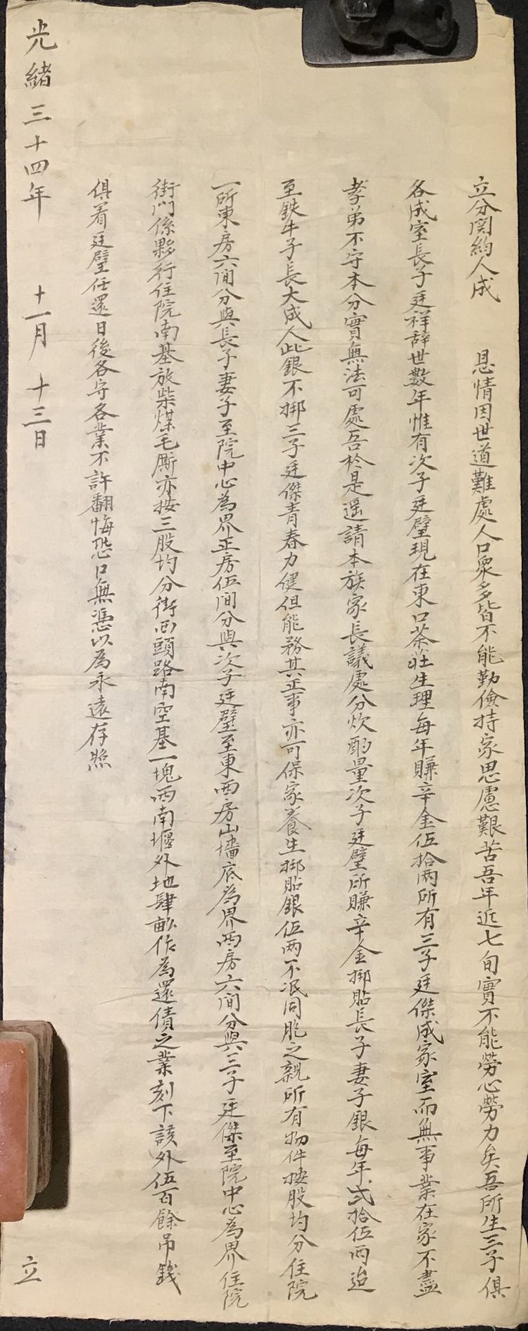 光緒三十四年詒遠(yuǎn)堂成廷璧之父成恩分炊契約