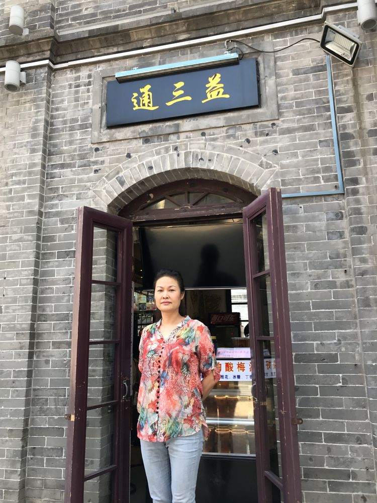 位于北京前門大街鮮魚口恢復(fù)后的*********通三益,圖中人物為成廷璧曾孫媳朱麗彬女士拜謁通三益。